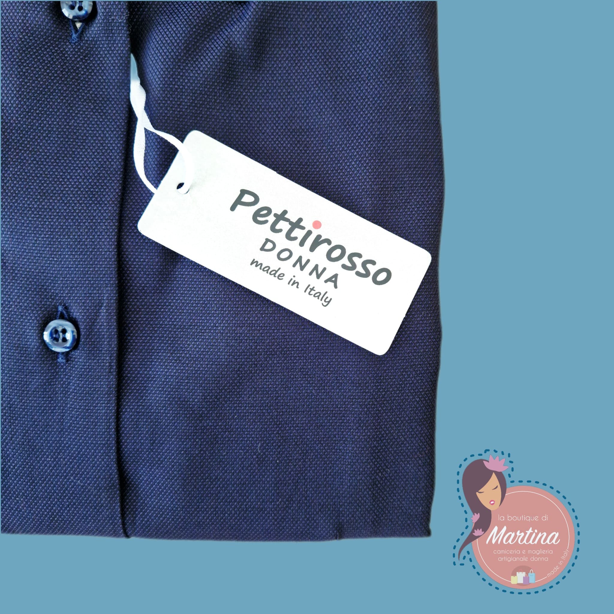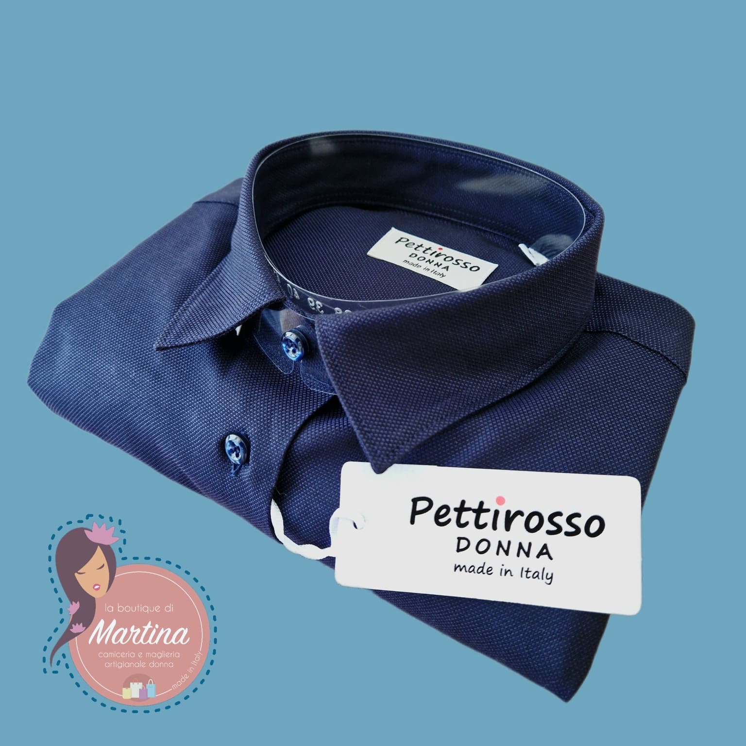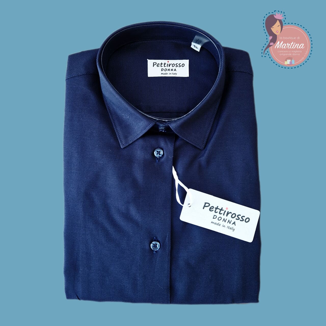 Linea PETTIROSSO DONNA, serie CLASSIC, colore blu, cotone Oxford tipologia panama, tessuto pregiato, naturale e di facile e veloce stiratura.