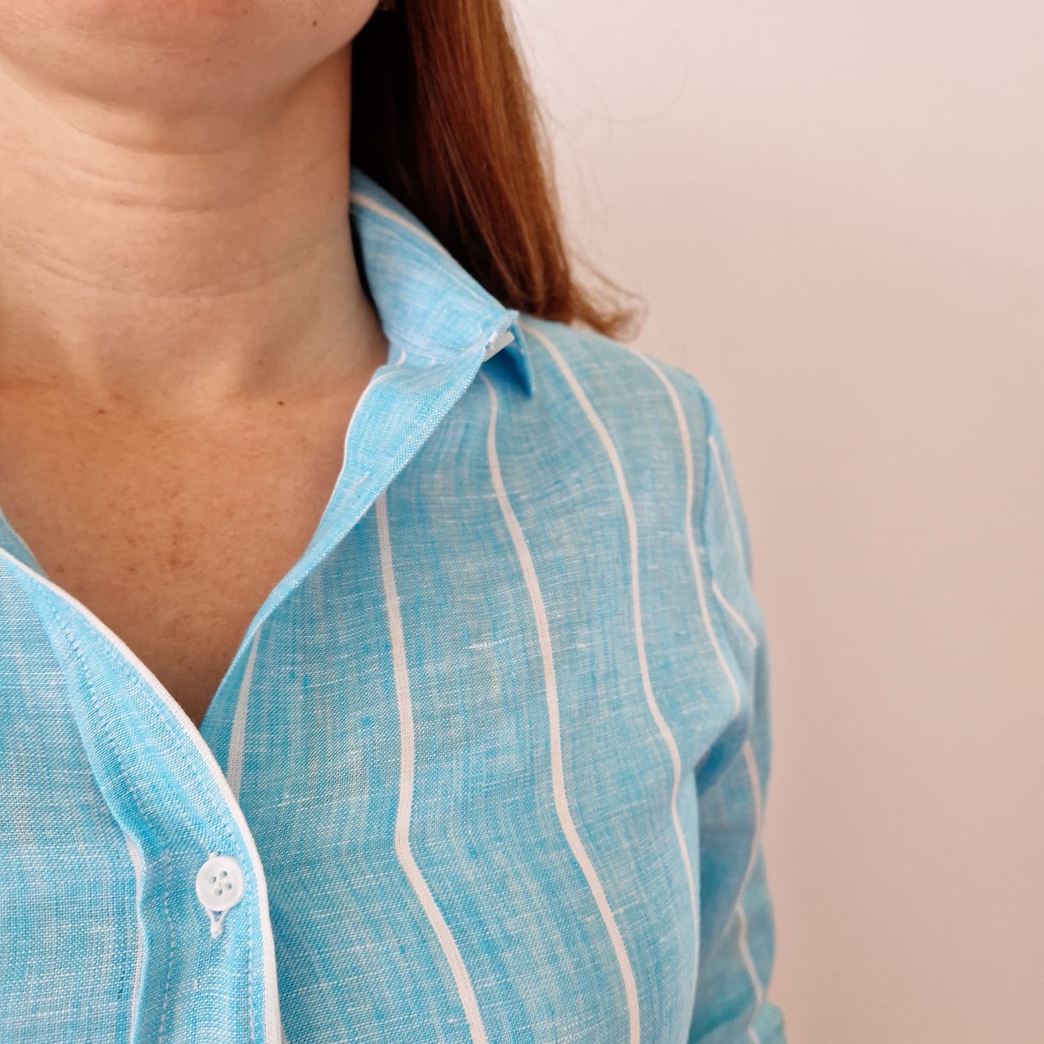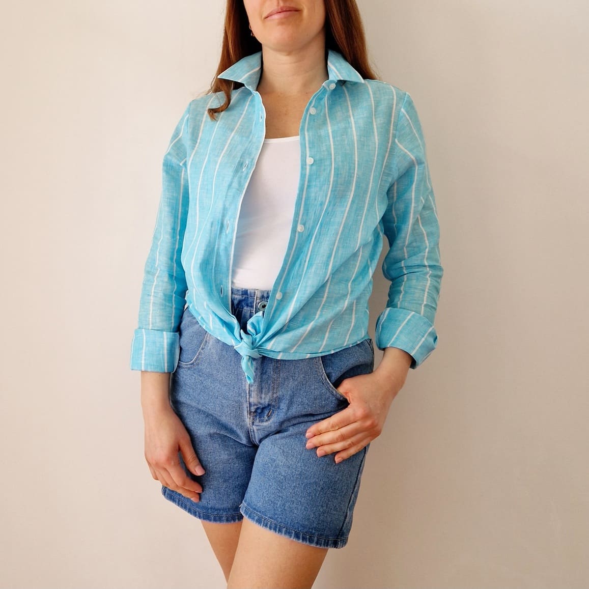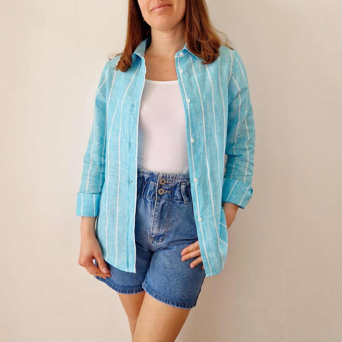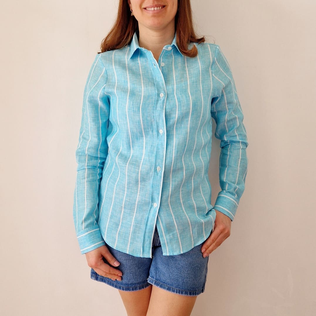 Camicia color turchese con riga bianca in PURO LINO della nostra linea esclusiva PETTIROSSO DONNA.