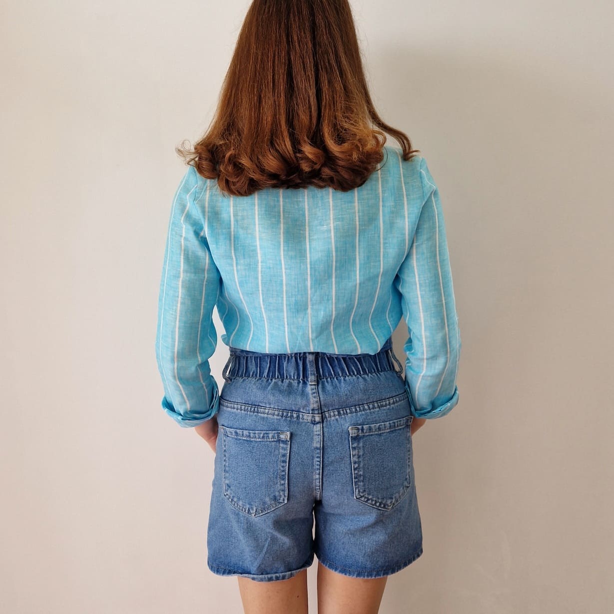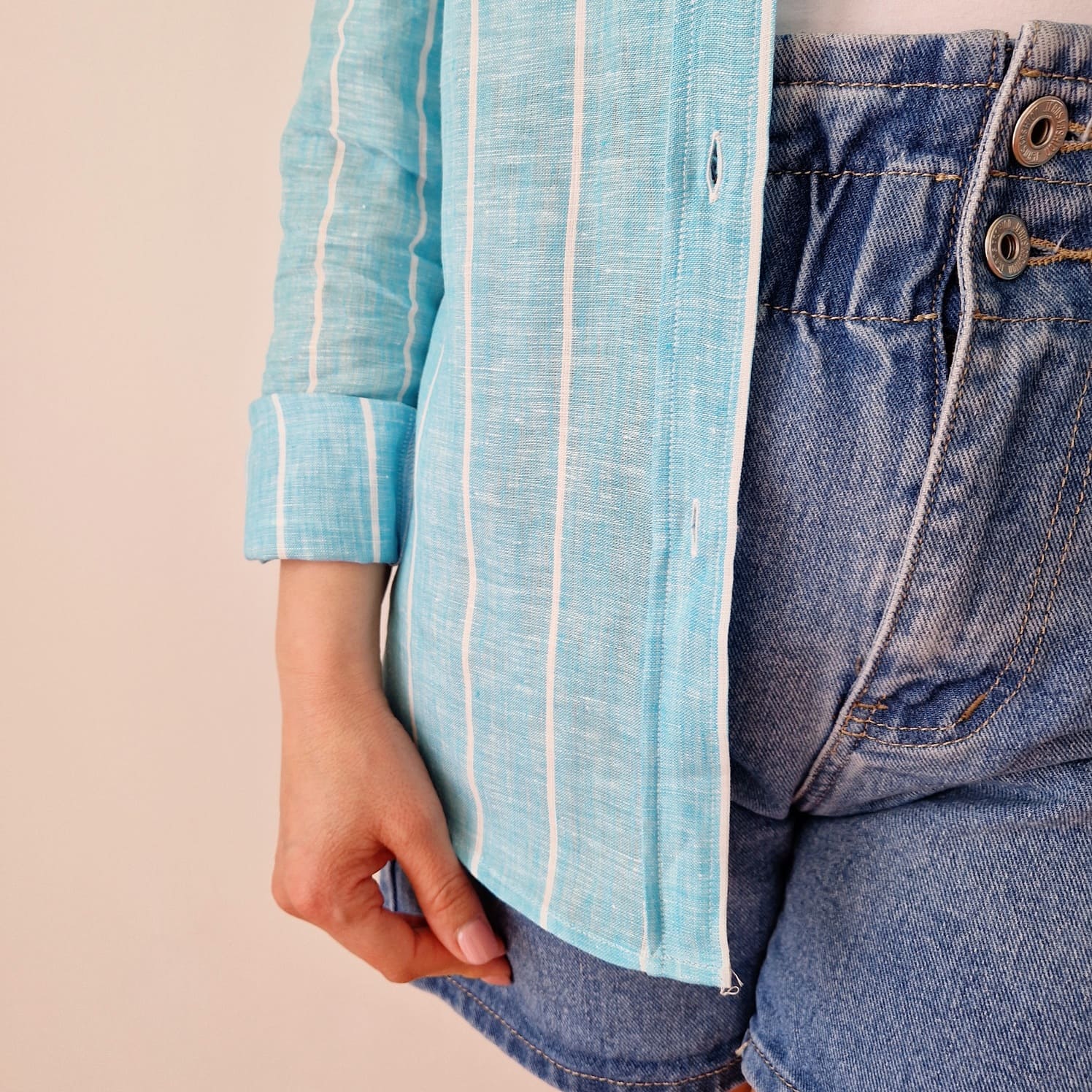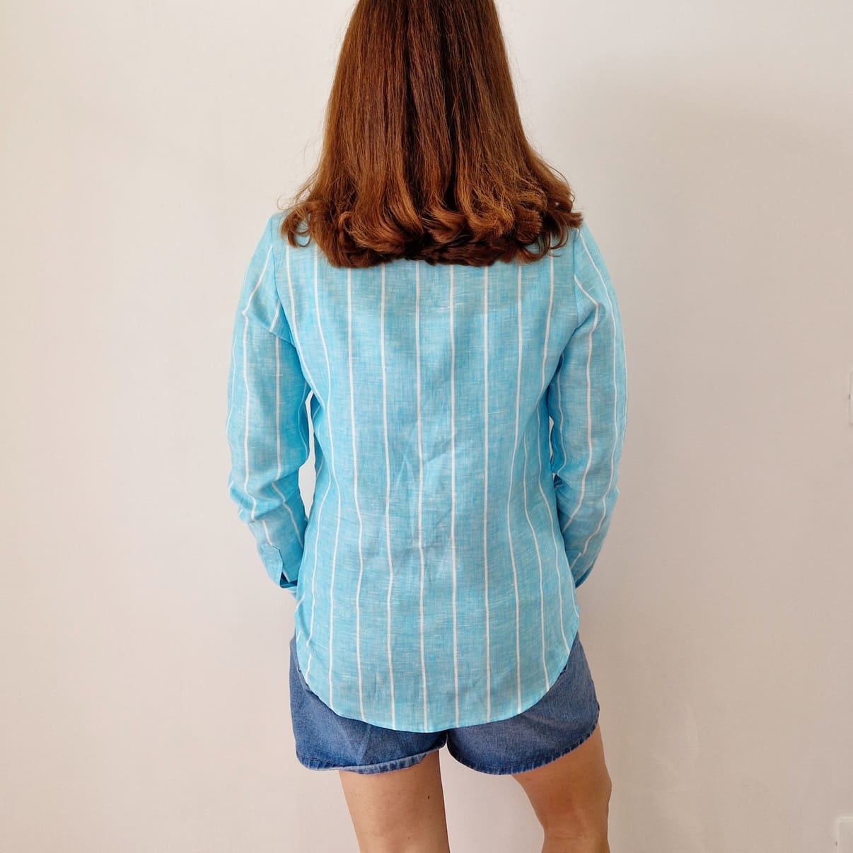Camicia color turchese con riga bianca in PURO LINO della nostra linea esclusiva PETTIROSSO DONNA.